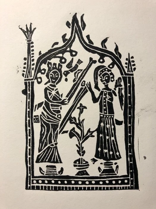 Ellen Siebel-Achenbach, linocut on paper, 2021. Annunciation Scene.